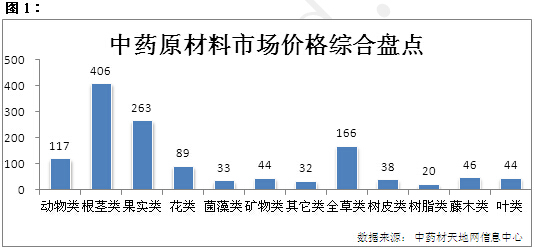 (一) 中药材原料市场价格综合盘点 1. 监测品规基本信息总体概览 1.1 监测品规种类分布 本报告共监测各市场品规价格共1298个(本期年度监测报告中更新了部分品规的规格)。其中根茎类品规计406个,果实籽仁类品规计263个,全草类品规计166个,动物类117个,花类89个,矿物类44个,叶类44个,藤木类46个,菌藻类33个,树皮类38个,树脂类20个、其他类32个。范围涵盖中药材各类品规,中药材常用的大宗品规都包含在监测范围之中(见图1)。