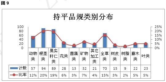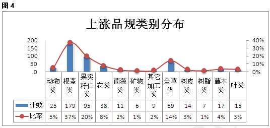与去年同期价格相比,上涨品规(见图4)。上涨品规分布:根茎类179个,占总量37%;果实类95个,占比20%;动物类25个,占比5%;全草类69个,占比14%;叶类15个,占3%;花类38个,占比8%;藤木类17个,占比4%;菌藻类11个,占比2%;矿物类6个,占比1%;树皮类14个,占比3%;树脂类7个,占比1%;其他类9个,占比2%。