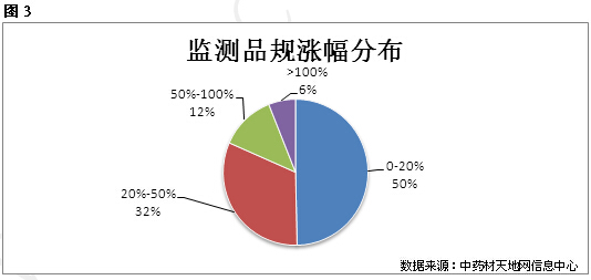 2.1 监测品规涨幅分布 与去年同期价格相比,本月监测品规价格上涨的品规共485个,其中涨幅在0-20%之间共241种,占比达50%;涨幅在20%-50%之间共155种,占比达32%;涨幅在50%-100%共60种,占比达12%;涨幅大于100%共29种,占比达6%(见图3)。