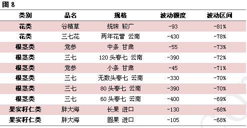 以下上涨幅度前10名榜单(见图5).其中羊鞭、降香、透骨草、蔷薇花等涨幅居前。