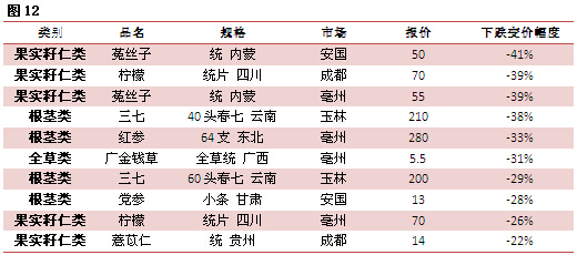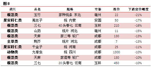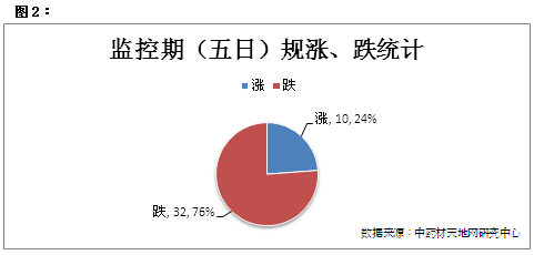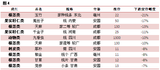 本监控期(2014.10.24-2014.10.28),以下下跌幅度前10名榜单(见图4).其中玉竹、菟丝子、天麻等跌幅居前。