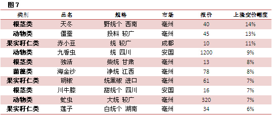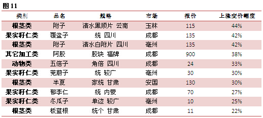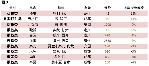 本监控期(2014.10.24-2014.10.28),以下上涨幅度前10名榜单(见图3).其中僵蚕、赤小豆、九香虫等涨幅居前。