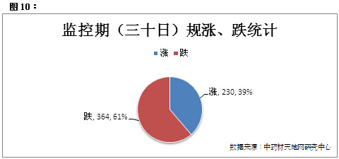 本监控期(2014.9.28-2014.10.28),升价品规230个,升价品规占变价总量39%;降价品规364个,降价品规占变价总量61%。(见图10)