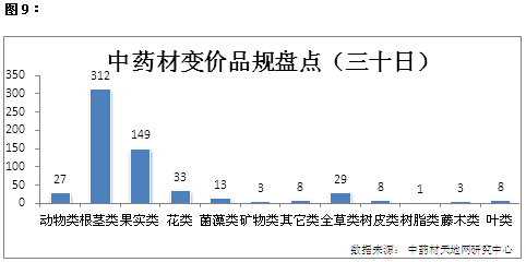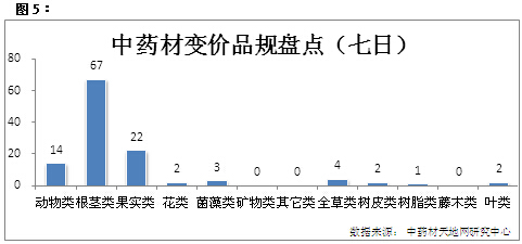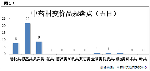 一、监控期为五日(2014.10.24-2014.10.28) 1.变价品规种类分布 本监控期(2014.10.24-2014.10.28)共监测各市场变价品规价格共42个。其中根茎类品规计22个,果实籽仁类品规计9个,全草类品规计1个,动物类8个,花类0个,矿物类0个,叶类0个,藤木类0个,菌藻类3个,树皮类2个,树脂类1个,其他类0个。范围涵盖中药材各类品规,中药材常用的大宗品规都包含在监测范围之中(见图1)。